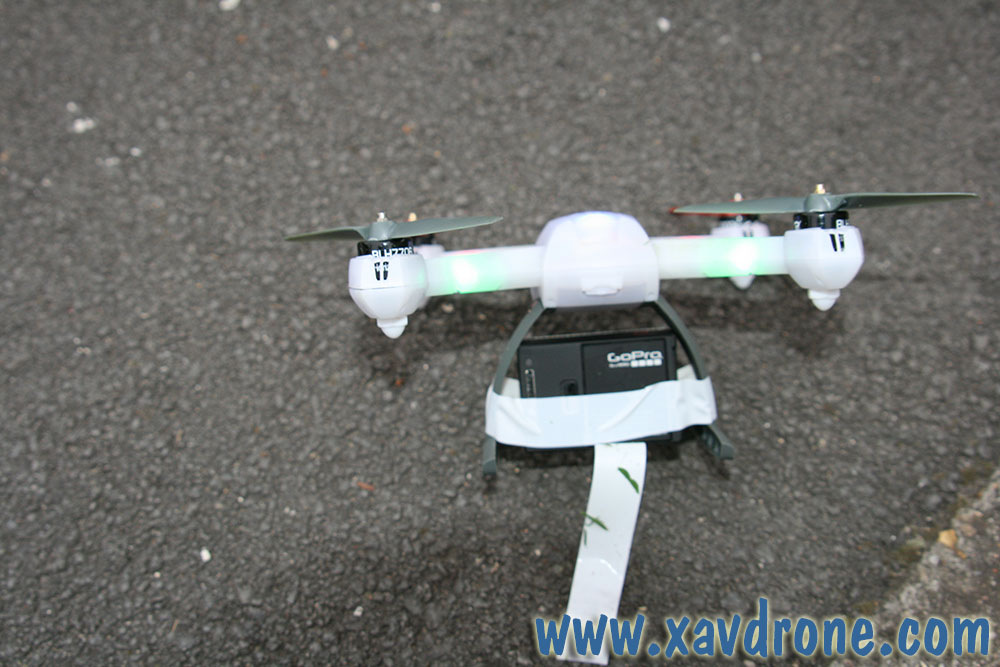 Prendre du ruban adhésif résistant et souple (ça serait dommage qu’il lâche en plein vol) et faite un tour avec pour encercler la Gopro en entourant le train d’atterrissage. Mettez la Gopro le plus haut possible (de toutes façons vous ne pourrez pas monter de trop) pour pouvoir vous poser sans que la caméra ne touche le sol.
